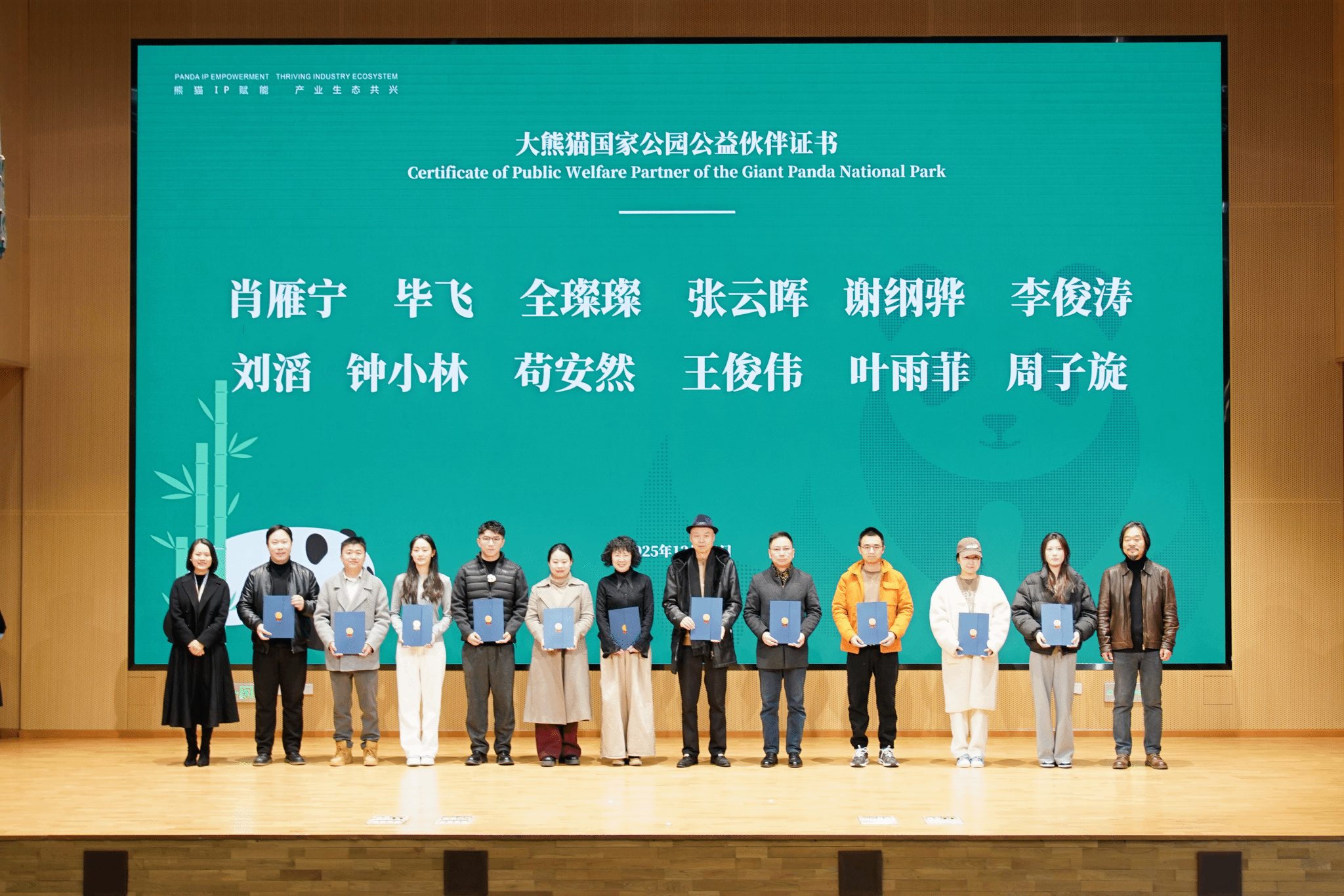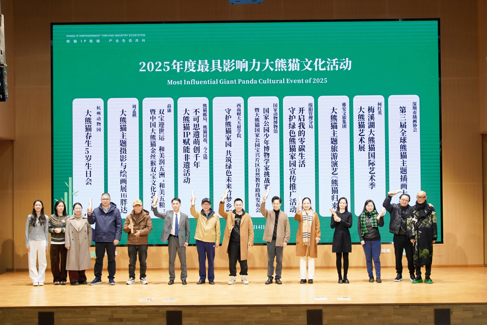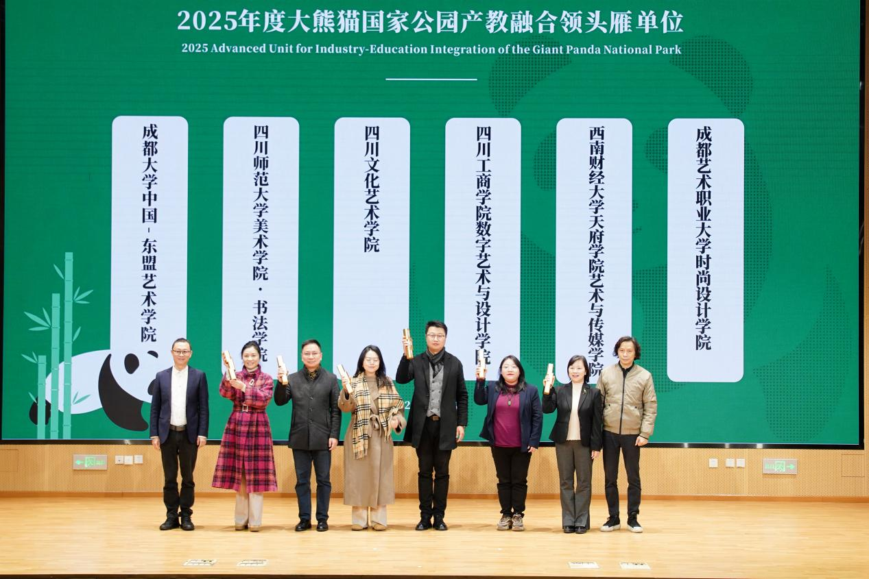随后,大会举行颁奖仪式。2025年度最具影响力大熊猫文化活动榜单揭晓。我院“西南财大天府学院守护熊猫家园,共筑绿色未来-竹梦乡野”荣获此奖项。奥运冠军、大熊猫国家公园文创联盟形象大使肖雁宁、成都大学中国-东盟艺术学院美术与设计学院名誉院长许燎源为获奖代表颁奖。同时,杭州动物园“大熊猫春生5岁生日会”、周孟棋“Hi胖达”主题艺术展、国家动物博物馆“国家公园少年博物学家挑战赛”等一批具有社会影响力的项目入选。
